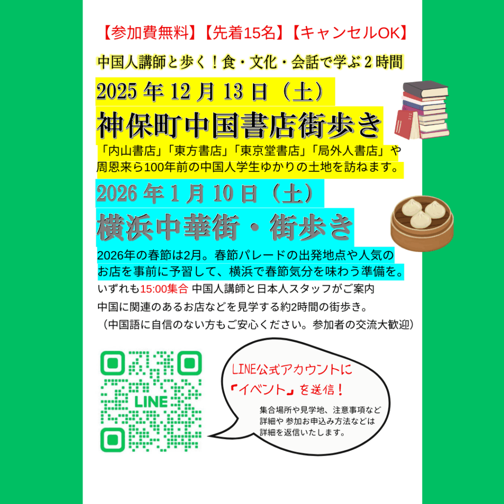 今月は、神保町の中国関連書店をめぐり、周恩来ら100年前の中国人留学生ゆかりの地も訪ねる街歩きイベントです。どなたでもご参加いただけます。お気軽にどうぞ!